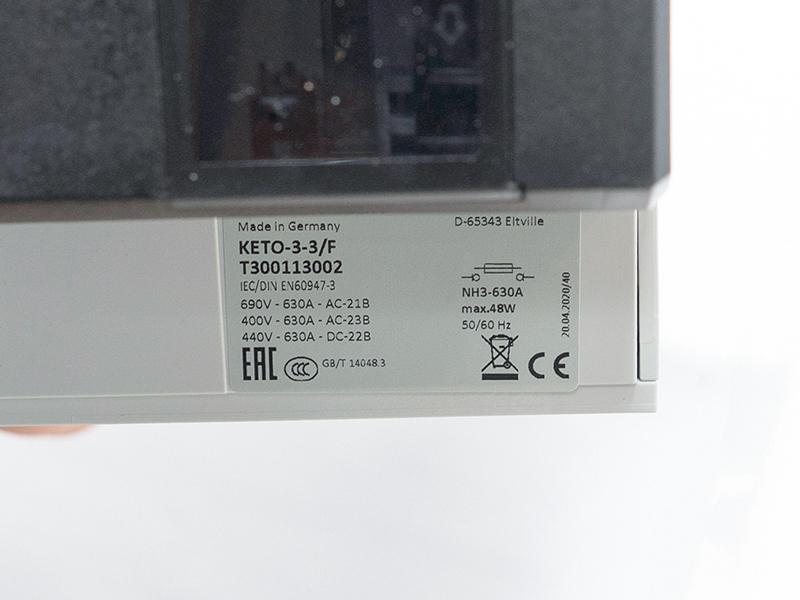 Rozłącznik bezpiecznikowy skrzynkowy KETO-3-3/F jest 3-fazowym aparatem łącznikowym przeznaczonym do zabudowy na płycie montażowej. Posiada plombowaną pokrywę oraz otwory umożliwiające pomiar napięcia na nożach wkładki bezpiecznikowej.Standardowo wyposażony jest w zaciski śrubowe M10 z możliwością dołożenia zacisków obejmowych, pryzmatycznych lub ramkowych.Pokrywa rozłącznika wykonana jest z samogasnącego tworzywa bez zawartości halogenków. Wszystkie części przewodzące są całkowicie chronione przed przypadkowym dotknięciem.Rozłączniki KETO stosowane są w rozdzielnicach przemysłowych, mieszkaniowych, w złączach kablowych i pomiarowych oraz w układach kompensacji mocy biernej.