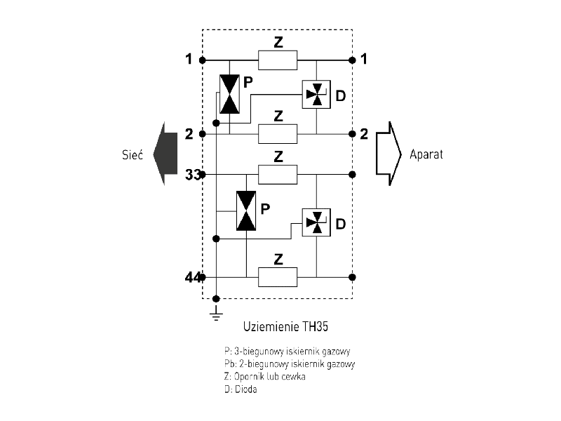 - Ekran przewodu jest dodatkowo uziemiony przez iskiernik gazowy