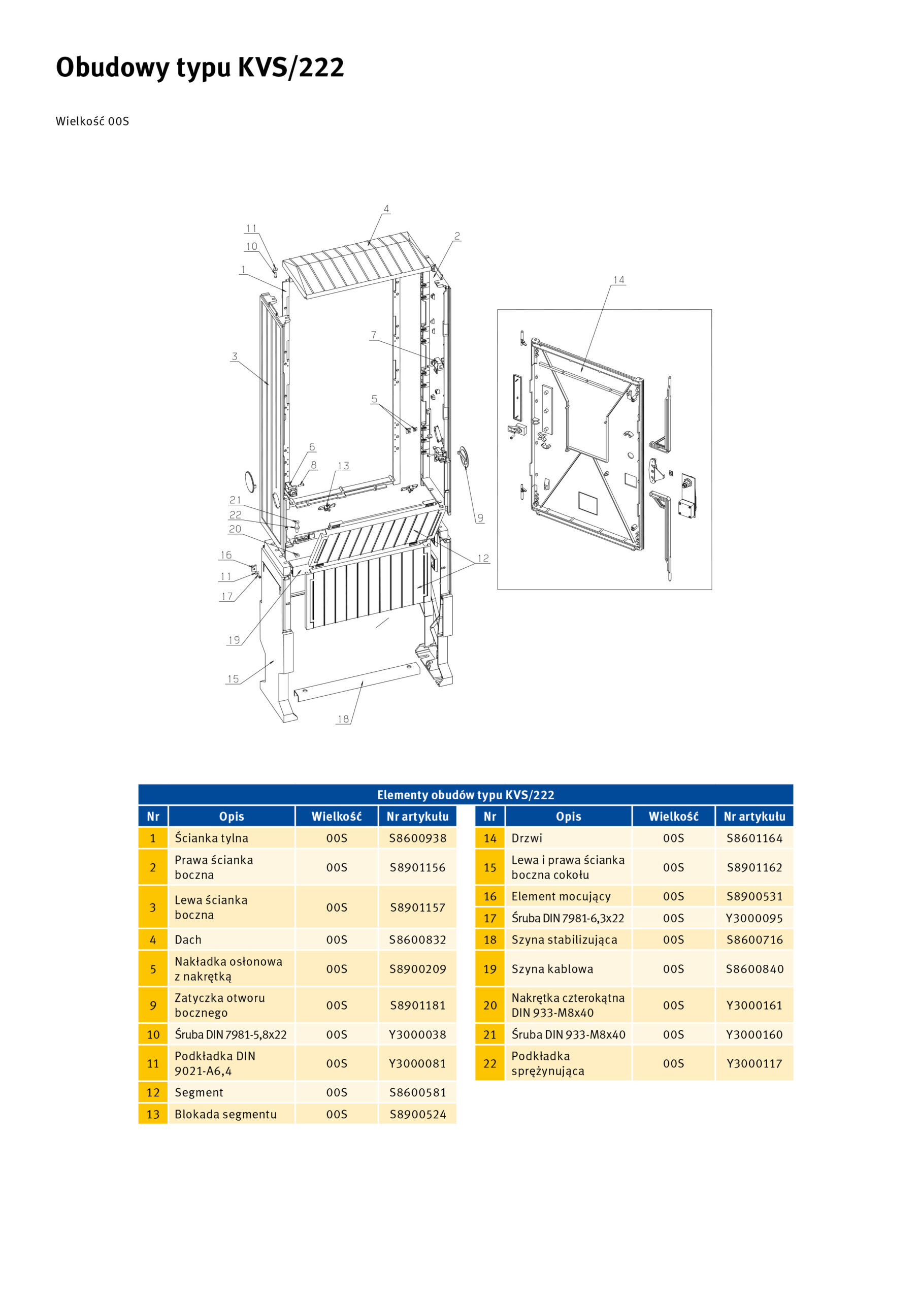 Szafki typu KVS00S/222/SV mają głębokość zewnętrzną 222 mm i wykonane są z trudnopalnego (samogasnącego) poliestru wzmacnianego włóknem szklanym. Materiał zapewnia wysoką odporność na warunki atmosferyczne i uszkodzenia mechaniczne. Szafki dostarczane są standardowo w kolorze szarym wg. RAL7035. Profilowana struktura powierzchni uniemożliwia naklejanie plakatów. Odpowiednio zaprojektowane otwory wentylacyjne zapobiegają gromadzeniu się wilgoci. Szafki wraz z cokołami dostarczane są w kompletach. Połączenie z cokołem ma ustalone miejsce ewentualnego pęknięcia, co w przypadku mechanicznego uszkodzenia zabezpiecza cokół przed zniszczeniem. Szafki składają się z elementów umożliwiających ich szybki montaż. Drzwi otwierają się pod kątem 180°. Oferowane są z klamką uchylno-obrotową przystosowaną do jednej lub dwóch wkładek patentowych, albo do kłódki energetycznej. Kable doprowadzane są od dołu i mocowane we wnętrzu cokołu do szyny kablowej. Możliwa jest zabudowa szaf szynami zbiorczymi lub płytami montażowymi. Dla zwiększenia stabilności posadowienia, cokół wkopuje się w ziemię do określonej głębokości.