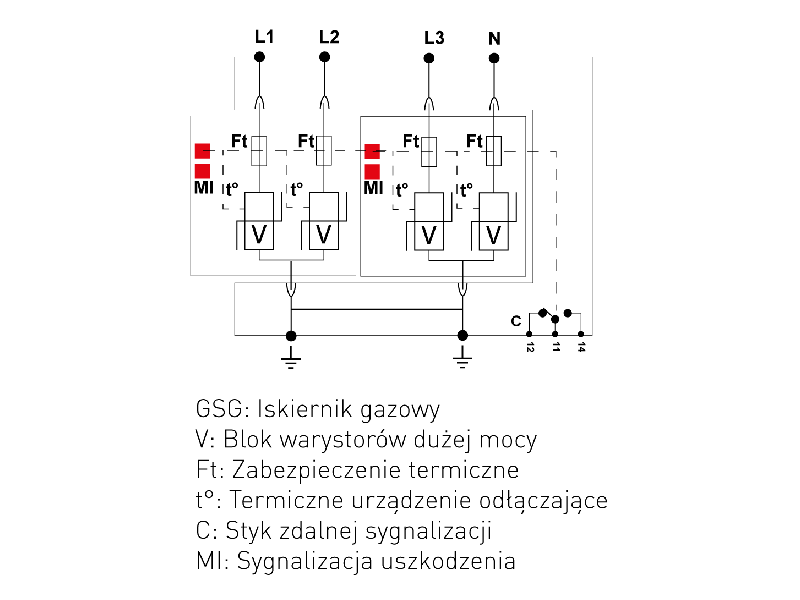 - Znamionowy prąd wyładowczy (8/20µs) In=20kA/bieg.