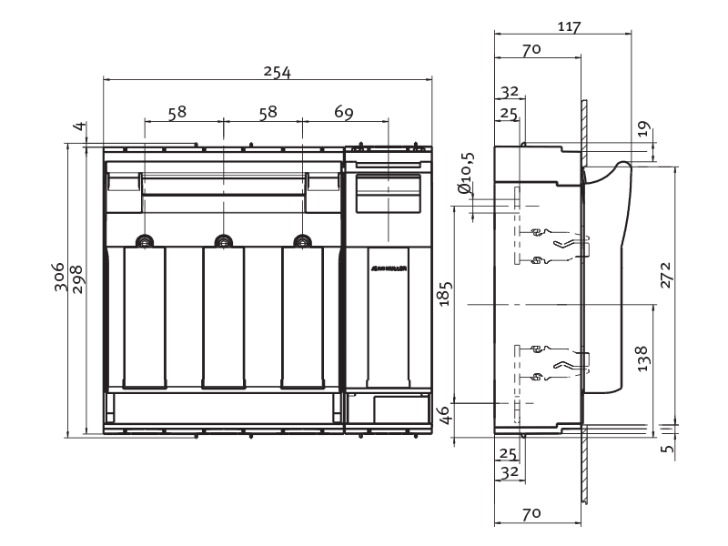 Rozłącznik bezpiecznikowy skrzynkowy KETO na szyny o rozstawie 60mm