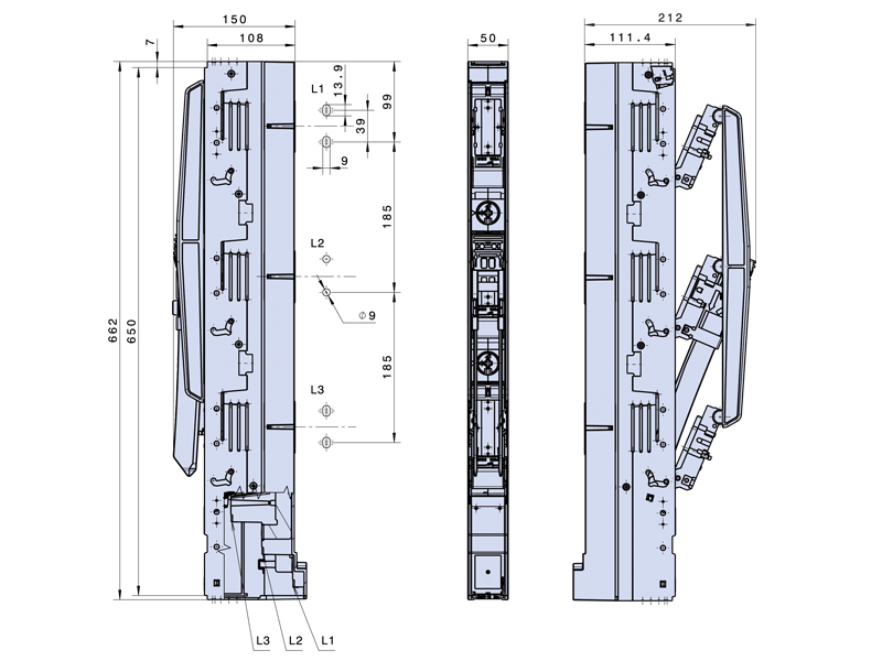 Szerokość zabudowy 50 mm. Montaż bezpośredni na szynach prądowych o rozstawie 185 mm.
