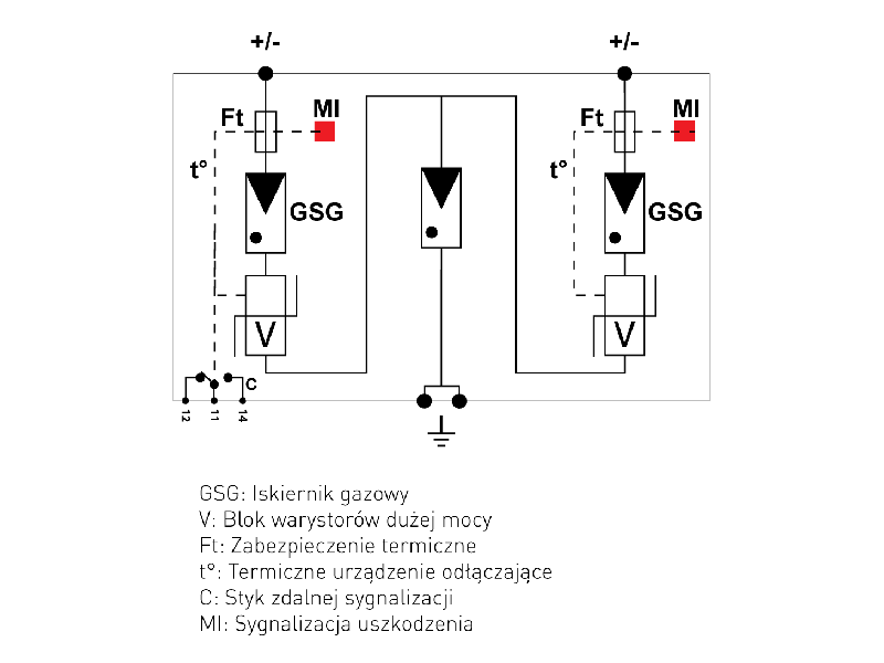 - Wytrzymałość udarowa na biegun (10/350 μs): Iimp= 12,5kA; Itotal=25kA