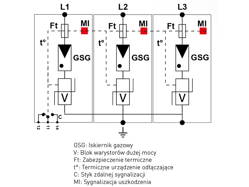 - Znamionowy prąd wyładowczy (8/20µs) In=20kA/bieg.