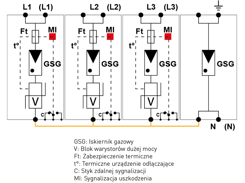 • Znamionowy prąd wyładowczy (8/20µs) In=20kA/bieg.
