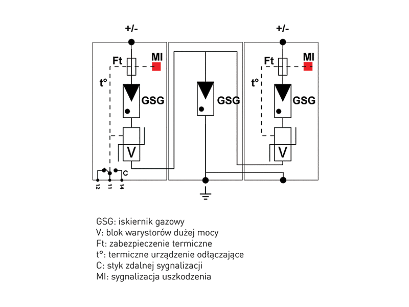 - Prąd wyładowczy: In (8/20 μs) = 15kA/bieg.