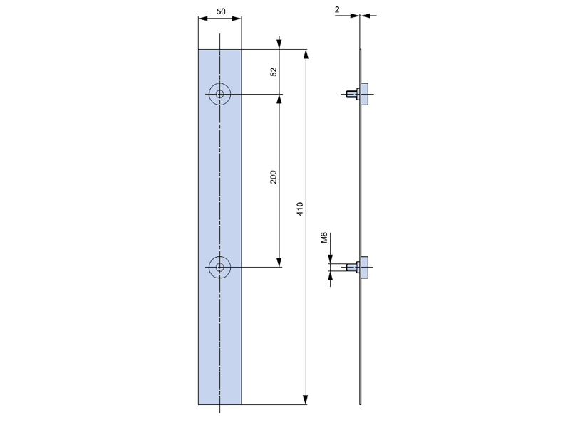 Osłona pola rezerwowego, o szerokości 50 mm w systemie szyn o rozstawie 100 mm, przykręcana śrubami z tworzywa sztucznego M8 bezpośrednio do szyn lub do adaptera AL185-SL00/100/52.
