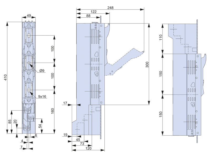 Szerokość zabudowy 50 mm. Montaż bezpośredni na szynach prądowych o rozstawie 100 mm. Montaż pośredni za pomocą adaptera AL185-SL00/100/52 na szynach prądowych o rozstawie 185 mm.