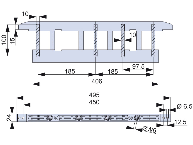 Nośnik szyn zbiorczych SST-185/10010, przekrój szyny 100 mm x 10 mm. Przeznaczony do 2, 3, 4 biegunowego systemu szyn zbiorczych o rozstawie 185 mm.