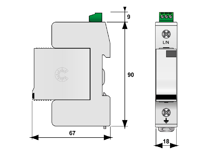 - Znamionowy prąd udarowy (10/350µs) Iimp=8kA/bieg.