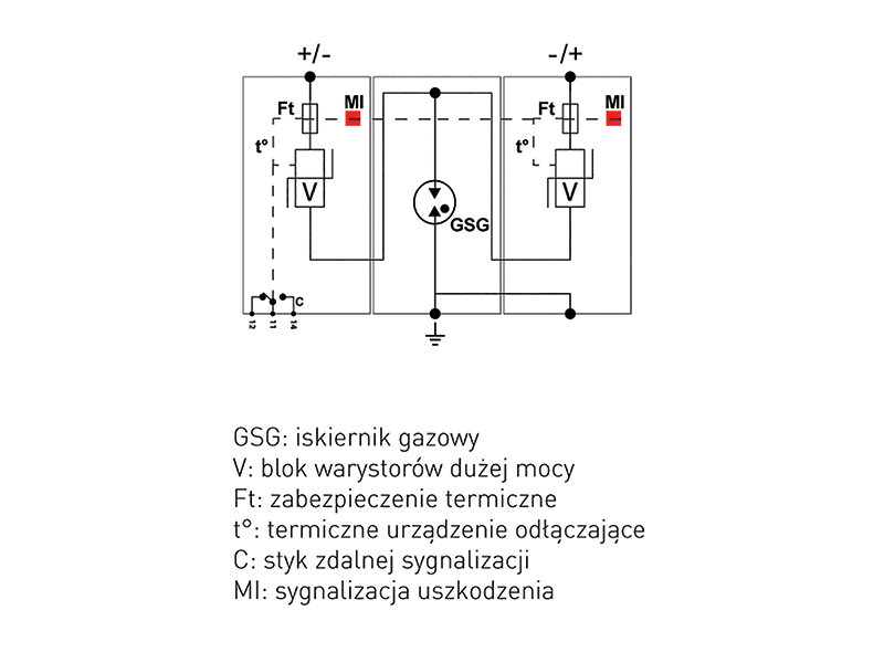- Prąd wyładowczy: In (8/20 μs) = 15kA/bieg.