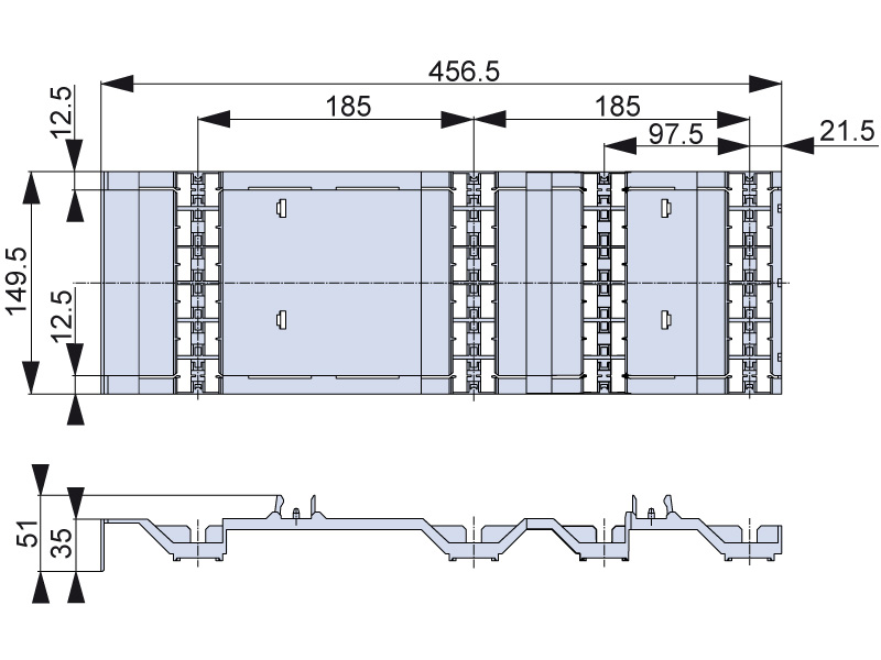 Osłona szyn zbiorczych SSA-185, wysokość 150 mm. Przeznaczona do 2, 3, 4 biegunowego systemu szyn zbiorczych. Stopień ochrony szyn zbiorczych IP20. Osłony montowane są na profilach BS1/SST.