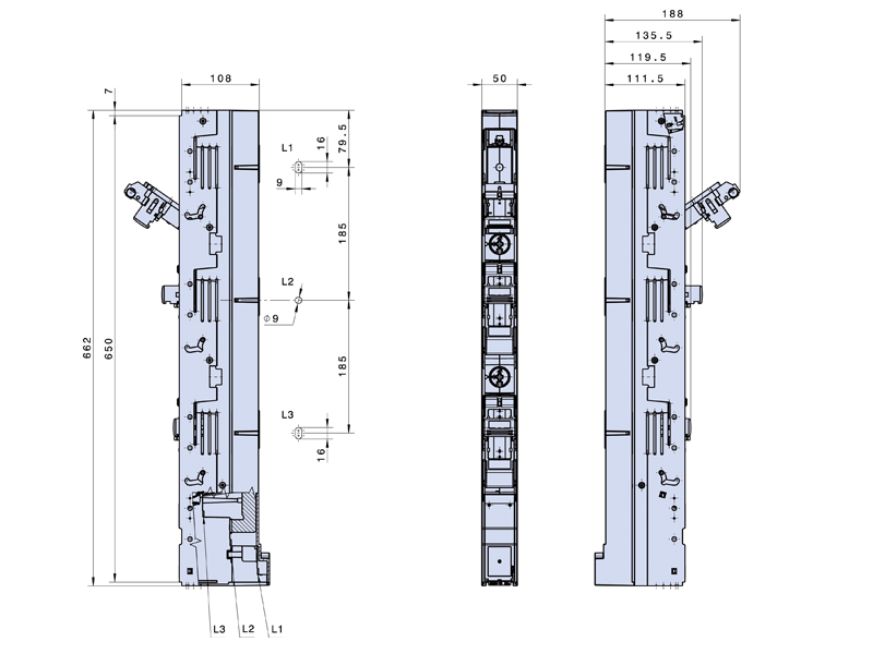 Szerokość zabudowy 50 mm. Montaż bezpośredni na szynach prądowych o rozstawie 185 mm.