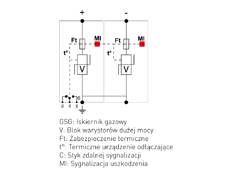 • Zgodne z normami IEC 61643-11, EN 61643-11, EN 50539-11 i UTE C 61-740-51