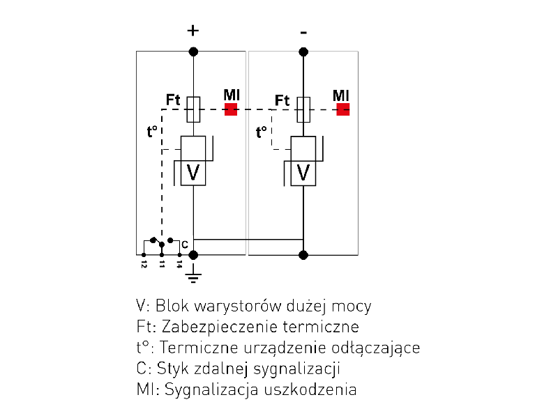 • Zgodne z normami IEC 61643-11, EN 61643-11, EN 50539-11 i UTE C 61-740-51