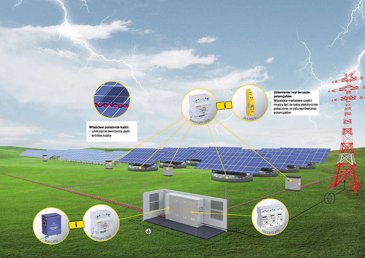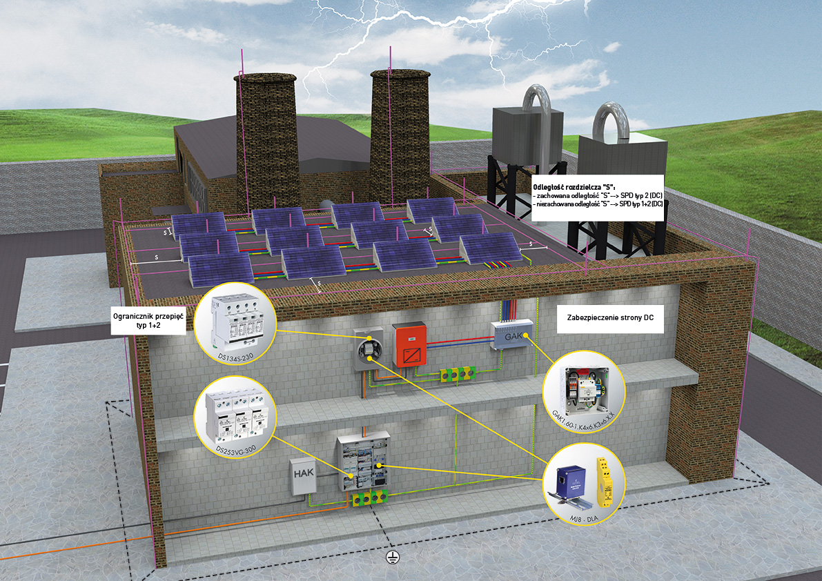 Przy elektrowniach PV standardem jest stosowanie rozbudowanej sieci instalacji odgromowej, dlatego zaleca się zainstalowanie ograniczników przepięć typu 1+2 np. DS60VGPV.., lub w przypadku bardzo dobrze wykonanej instalacji odgromowej i posiadaniu odpowiednich wyliczeń można zastosować ograniczniki typu 1+2 na prąd udarowy 5kA na biegun w technologii VG np. DS50VGPV…/10KT1