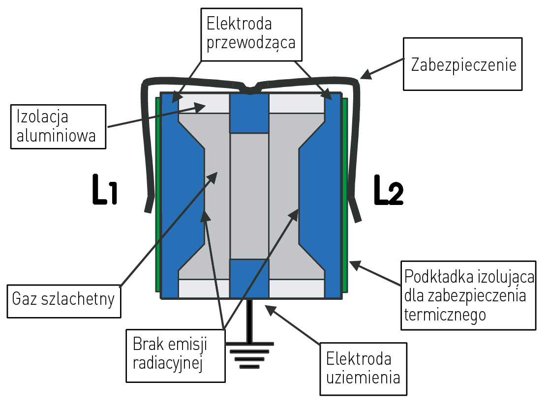 Te elementy składają się z dwóch lub trzech elektrod umieszczonych w obudowie, która jest wypełniona nieradioaktywnym gazem szlachetnym o określonym ciśnieniu. Obudowa jest rurką ceramiczną zakończoną z obu stron metalowymi wieczkami, które służą za elektrody.