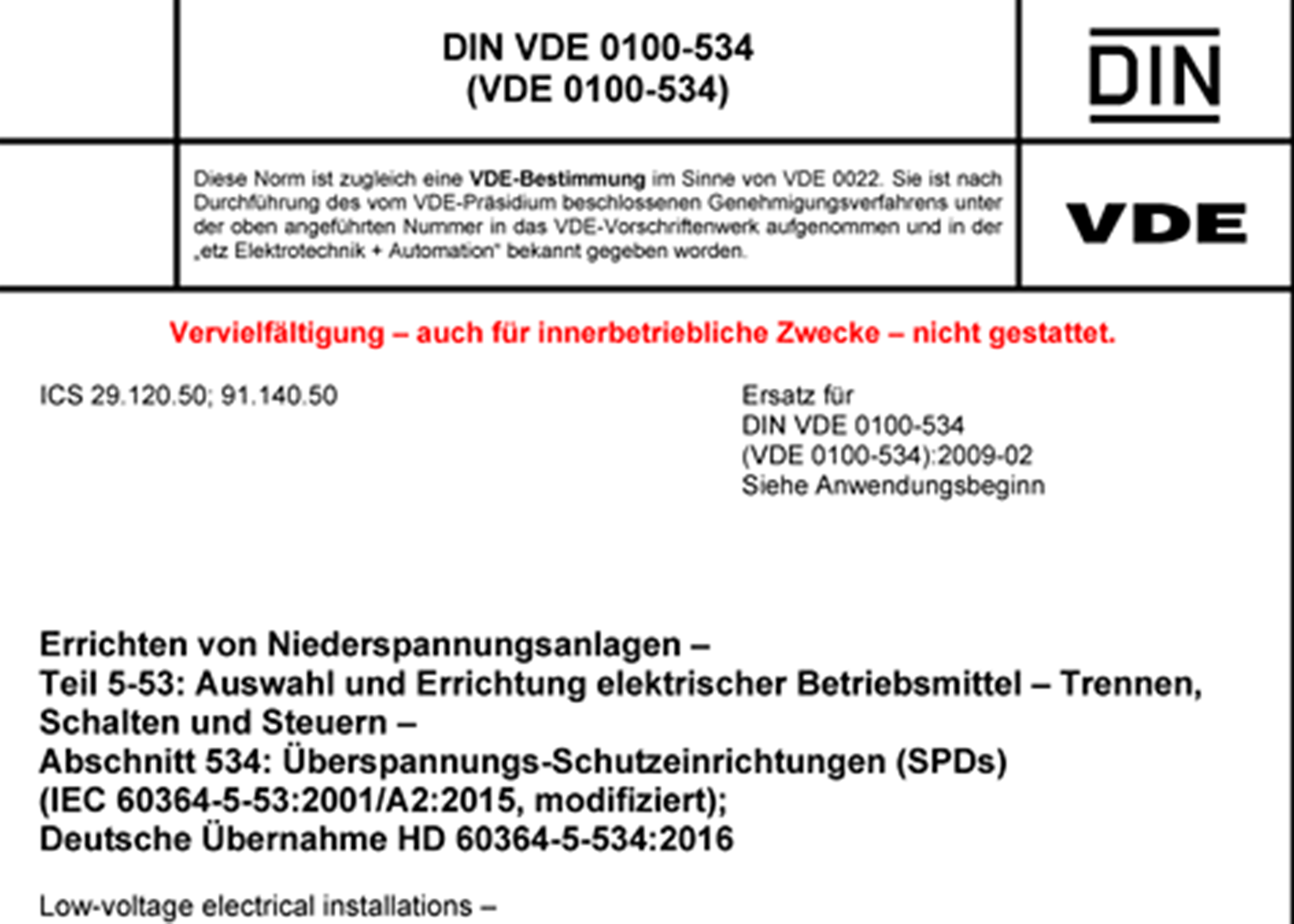 Norma DIN VDE 0100-534 zawiera przede wszystkim wymagania dotyczące doboru i konstrukcji ograniczników przepięć SPD (Surge Protective Device). W zależności od układu sieci dokonuje się założeń co do wyboru konkretnego SPD, jak również definiuje się max. długość przewodów oraz ich przekroje. Występuje tu również wzmianka o podziale na strefy ochrony w zależności od klasy ogranicznika.