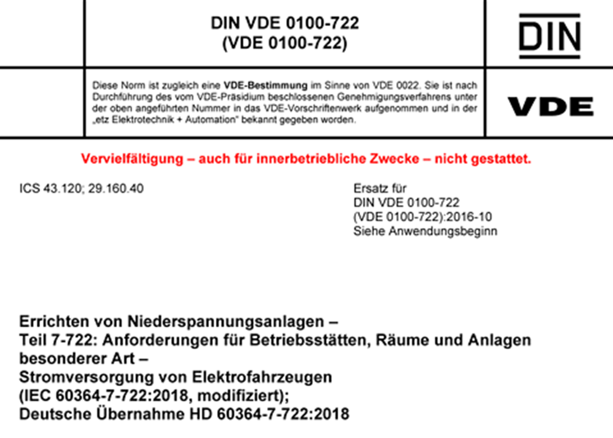 Powyższa norma opisuje wymagania dla przedsiębiorstw, obszarów i urządzeń szczególnego rodzaju – wszędzie tam gdzie znajduje się zasilanie pojazdów w energię elektryczną. W rozdziale 722.443 porusza się temat konieczności zastosowania ochrony przeciwprzepięciowej w celu ochrony urządzeń przed przepięciami przejściowymi wywołanymi wyładowaniem atmosferycznym i procesami łączeniowymi. Ważne jest również wymaganie, że przesył energii z lub do pojazdu elektrycznego musi przebiegać osobnym obwodem prądowym.