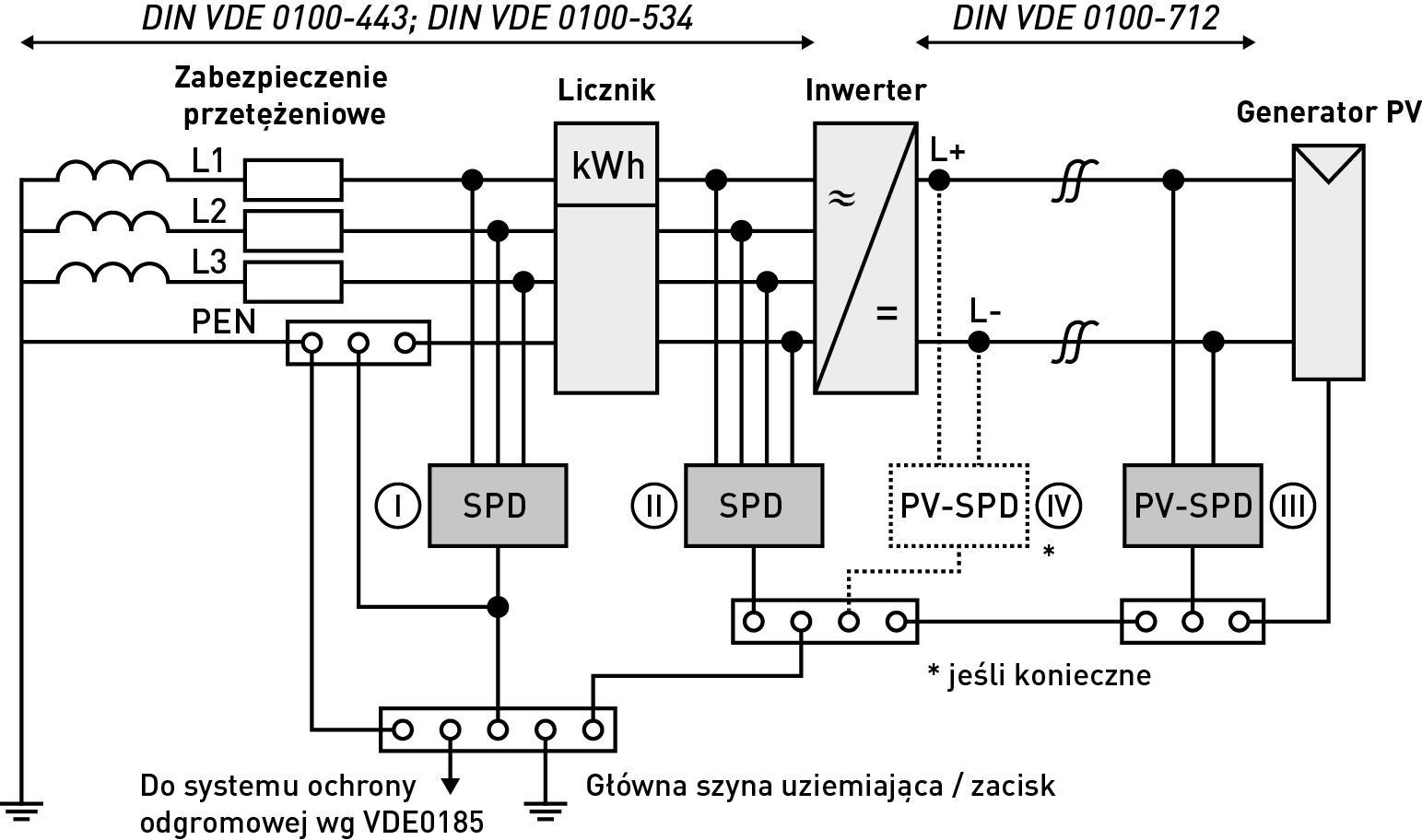 „Jeśli wymagana jest ochrona przed przepięciami przejściowymi zgodnie z DIN VDE 0100-443 […], to strona DC instalacji fotowoltaicznej również musi być odpowiednio chroniona”