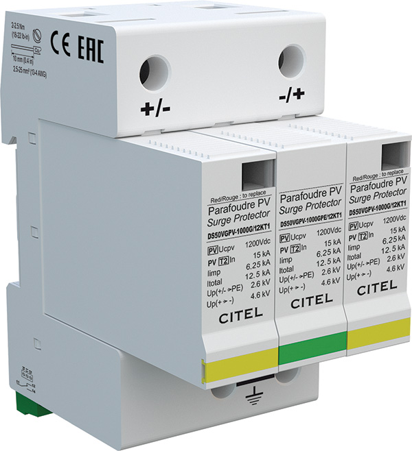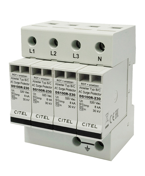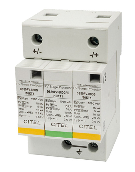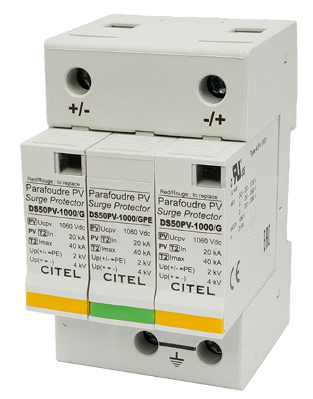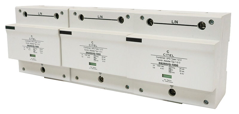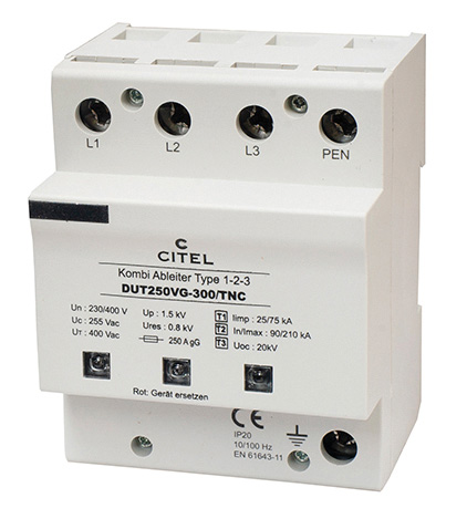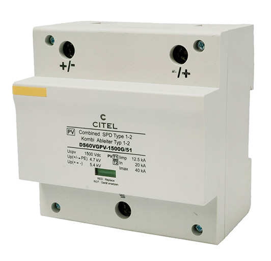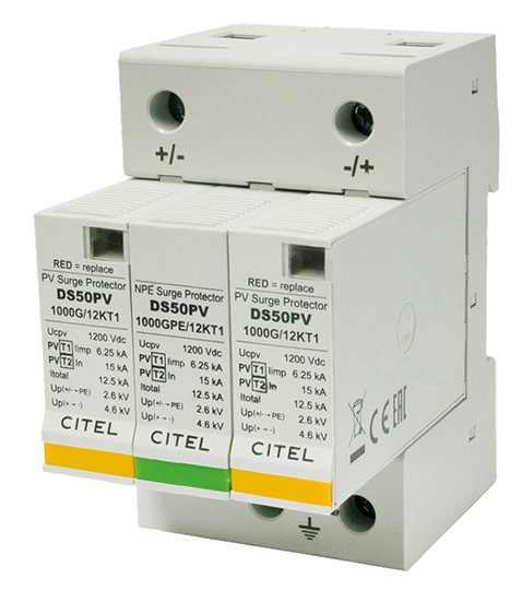 Konsekwentna ochrona strony AC, także w przypadku instalacji PV, musi być realizowana w oparciu o wytyczne normy PN-HD 60364-4-443. Ogranicznik kombinowany typu 1+2+3 zainstalowany w obszarze licznikowym zapewnia bardzo niski poziom ochrony Up oraz największą zdolność odprowadzania prądów piorunowych i wyładowczych. Alternatywnie do rozwiązań na szynę montażową TH, firma CITEL oferuje ograniczniki na most szynowy w rozstawie 40mm.