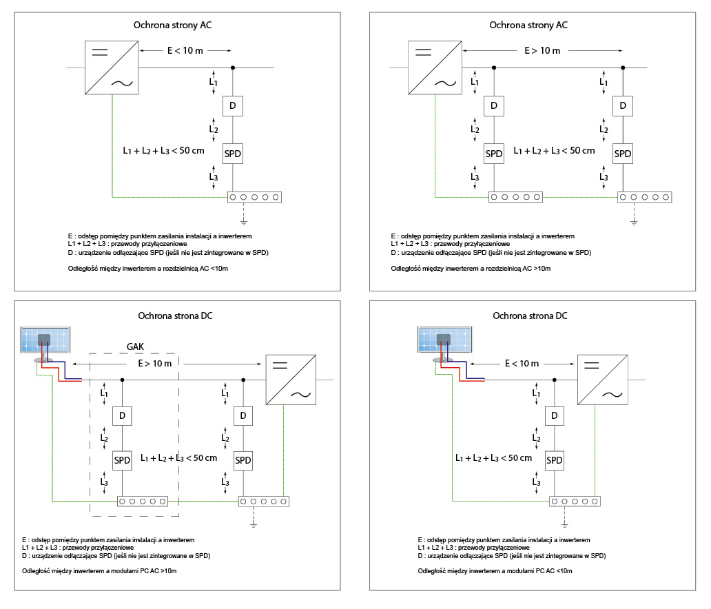 „The installation of SPDs on the DC and AC sides of a PV installation is mandatory unless indicated otherwise by a risk assessment.” (Instalacja SPD po stronie DC i AC instalacji PV jest obowiązkowa, chyba że w ocenie ryzyka wskazano inaczej).