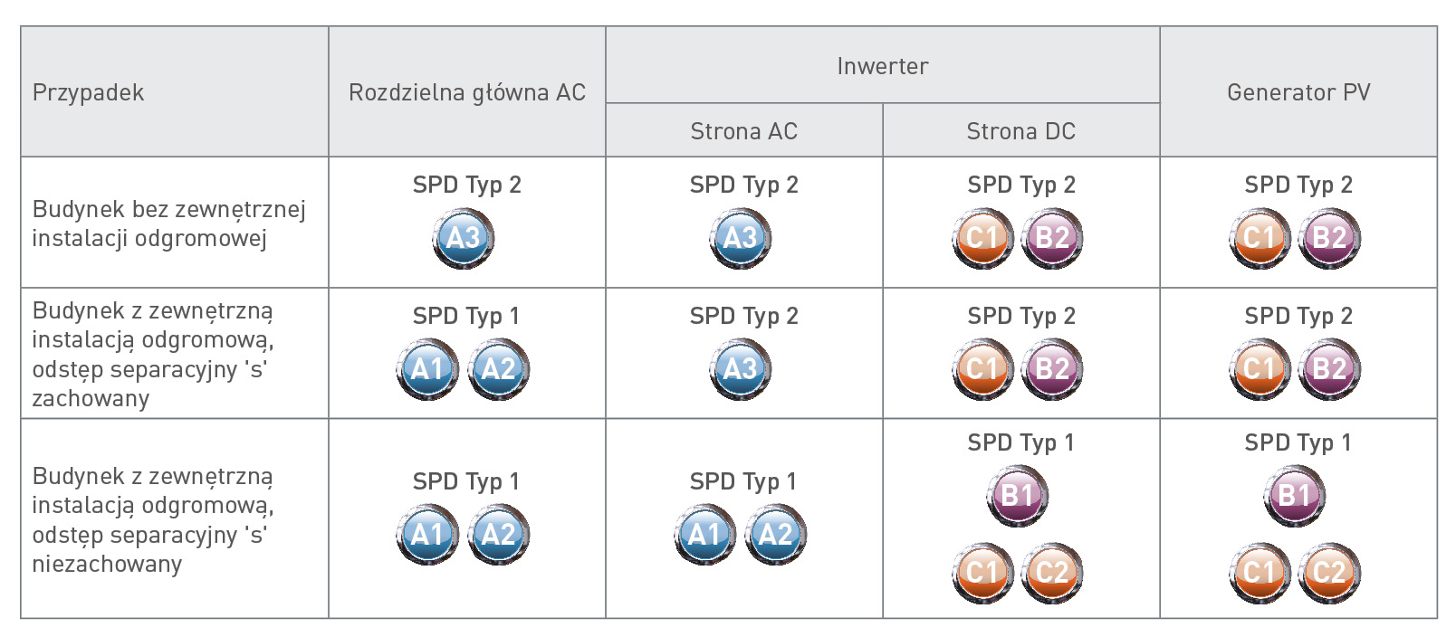 Dla instalacji PV na i przy budynkach, w załączniku C normy PN-HD 60364-7-712 podano minimalne wymagania do prawidłowego doboru ograniczników przepięć w poszczególnych częściach instalacji: