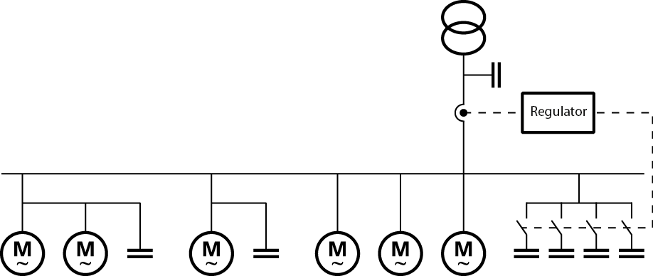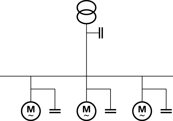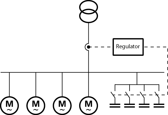 W najprostszym przypadku do każdego odbiornika indukcyjnego równolegle podłączony jest kondensator o odpowiedniej pojemności. Zapewnia to pełne odciążenie przewodów, w tym przewodu zasilającego użytkownika. W tym celu przyjmuje się, że kondensator jest używany tylko w okresie, w którym dana maszyna jest w eksploatacji. Ponadto, nie zawsze jest łatwo umieścić kondensatory bezpośrednio przy maszynach, które mają być kompensowane (problemy z przestrzenią, koszty montażu).