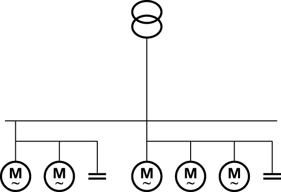Maszyny, które są zawsze załączone razem, mogą być zgrupowane i kompensowane razem. Zamiast kilku małych kondensatorów instalowany jest jeden kondensator lub bateria o odpowiednich parametrach.
