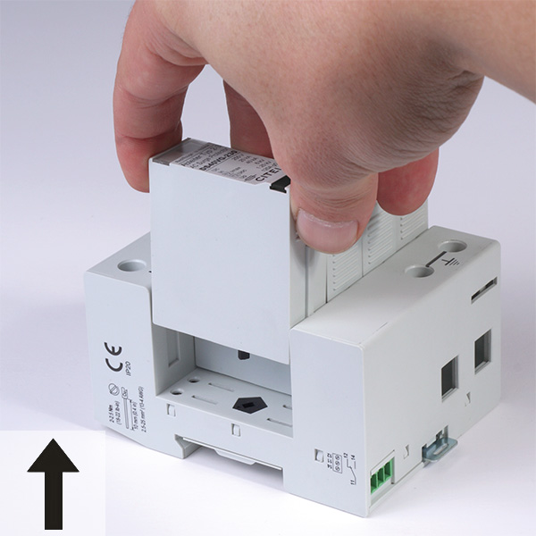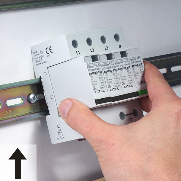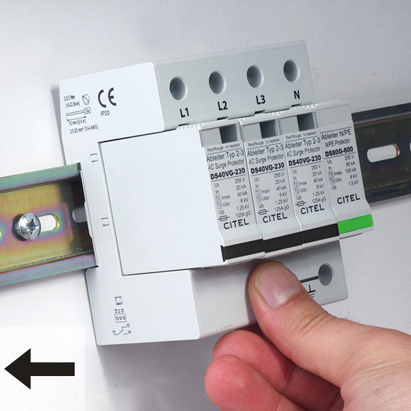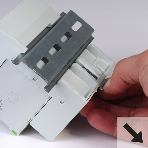 Ogranicznik przepięć dociska się do szyny do momentu zatrzaśnięcia.