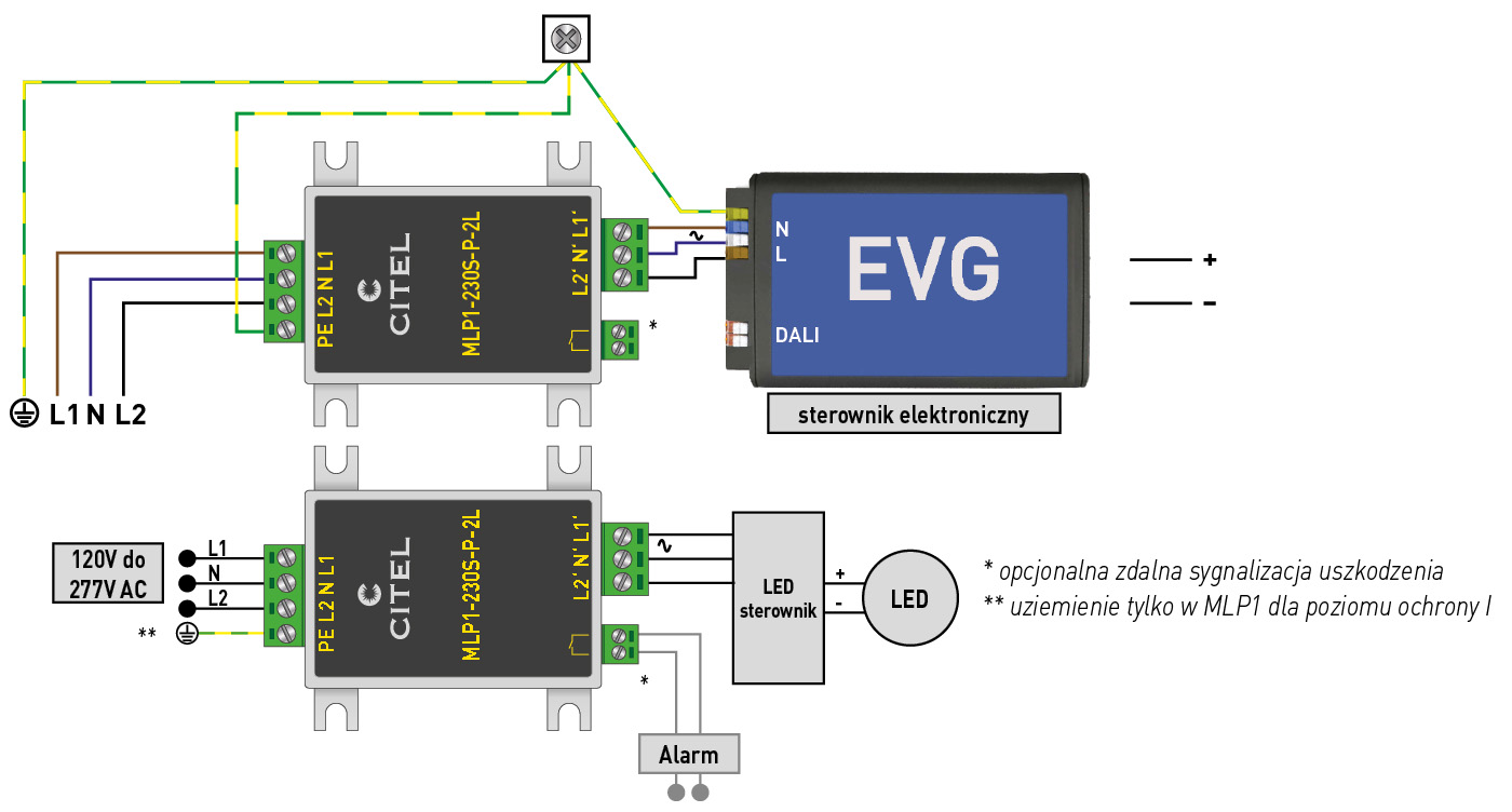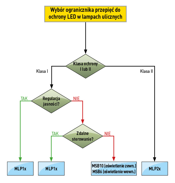 i są dostosowane do nominalnego prądu wyładowczego 8/20 µs o wartości 5kA i maksymalnego 10kA. Ograniczniki te wytrzymują też tzw. udar kombinowany 10kV/5kA wg IEC (15 impulsów) oraz 10kV/10kA wg IEEE (1 impuls), zapewniając poziom ochrony Up 1,5kV dla napięcia roboczego 230V AC. Dobierając ogranicznik do konkretnej instalacji trzeba ustalić kilka jego istotnych cech. Po pierwsze należy określić, jakie ma być napięcie zasilania – 230V AC czy np. 24V DC. Po drugie, czy interesują nas ograniczniki do lamp LED ze sterowaniem natężeniem oświetlenia, czy bez sterowania. Po trzecie, w zależności od stopnia ochrony mamy ograniczniki MLP1 dla klasy ochrony I i MLP2 dla klasy II. Po czwarte, czy będziemy zabezpieczać 1 fazę + N, czy 2 fazy + N. Kolejnym zagadnieniem jest określenie niezbędnego stopnia ochrony – ograniczniki montowane w szczelnych oprawach lub specjalnych skrzynkach mogą mieć stopień ochrony IP20, pozostałe powinny mieć IP65. Ograniczniki wg normy muszą posiadać miejscowy wskaźnik uszkodzenia, np. diodę LED. Niektóre mają także zdalną sygnalizację. Ogranicznik przepięć instaluje się albo w oprawie lampy blisko źródeł LED tuż przed zasilaczem, albo we wnęce na dole słupa latarni. Pierwsze rozwiązanie lepiej chroni zasilacz i diody LED, ale wadą tego rozwiązania jest, że w przypadku ograniczników bez zdalnej sygnalizacji uszkodzenia, a jedynie z sygnalizacją w formie zielonej diody LED zamontowanej w obudowie aparatu, nie ma możliwości łatwego sprawdzenia ewentualnego uszkodzenia ogranicznika, chyba że jest to wykonanie przerywające obwód zasilania w przypadku awarii. Umieszczenie ogranicznika w złączu, we wnęce słupa, ma 2 zalety – można go zainstalować w istniejących już lampach z oświetleniem LED oraz bez kłopotu sprawdzić stan ogranicznika dzięki dostępnej zielonej diodzie LED.