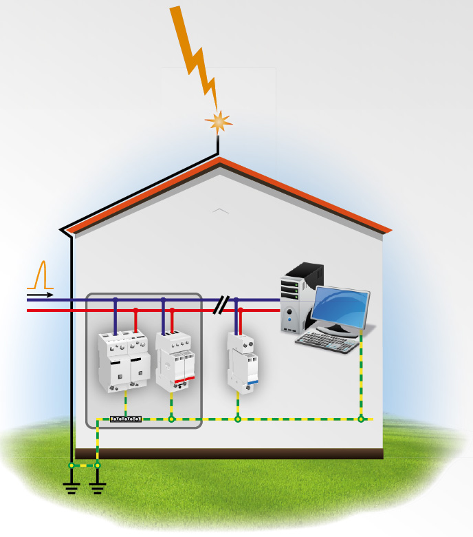 Prąd udarowy po uderzeniu pioruna w przewody napowietrzne wnika do instalacji elektrycznej przez te przewody, dlatego ogranicznik przepięć typu 1+2 jest instalowany w rozdzielnicy głównej jako jeden z pierwszych elementów od strony sieci zasilającej.