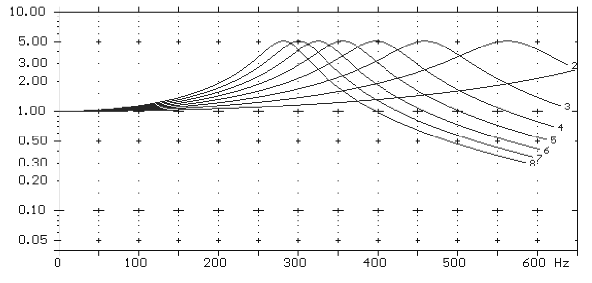 • przy częstotliwości rezonansowej poniżej 400Hz wzrosty rezonansowe siódmej harmonicznej,